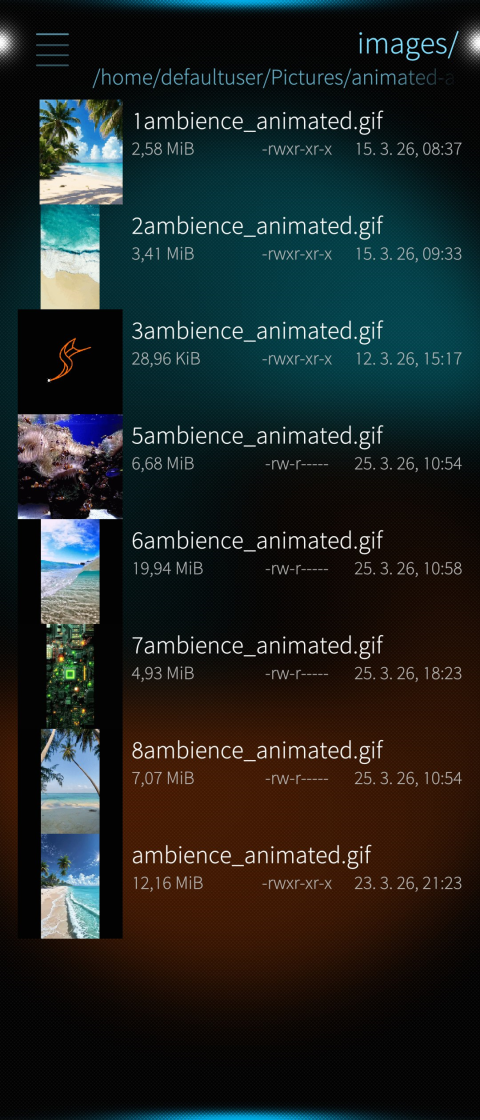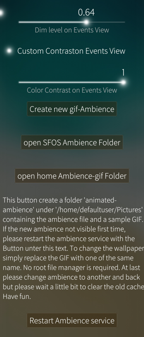 Description: Inspirited at a forum chat I create in the last weeks this patch. It makes that the gallery can show animated gif and that gif can run as ambience background. Unfortunately it’s not necessary to pick gif as ambience from the gallery. The reason is that this function are deep in the binary programming from SFOS and copy also gif only as jpg.